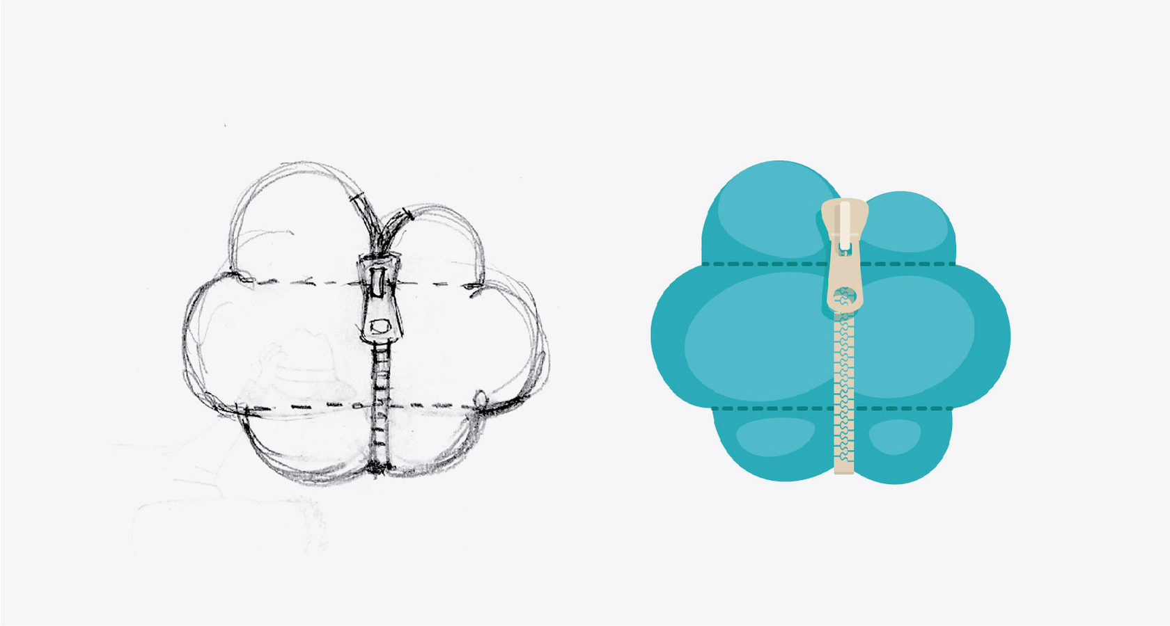 | | | | Слева — набросок к рисунку для химчистки Bowe. Справа — финальный рисунок для рекламного плаката. Рисунок и набросок Сергея Курбатова, сделан для айдентики химчисток. | | | Важно понимать — приступайте к работе, имея в голове чёткий план. Если нет плана, начните с самого начала — ответьте себе на вопросы и сформируйте общее видение проблемы. Самое сложное, с чего трудно начать — нарисовать первую линию на чистом листе бумаги. Это сложно сделать, так как линия не выражает вашу мысль, если нечего сказать. Поэтому начните рассуждать и сформулируйте себе задание, ответив на вопрос: на что похож пуховик? Пуховик состоит из пуха, он очень воздушный и легкий. В процессе генерирования идей мы нашли метафору — облако, которое имеет схожие визуальные характеристики с пуховиком. Пуховик такой же воздушный и легкий, как облако. Осталось совсем немного — представить абстрактный образ облака в виде несколько кругов, соединённых вместе. | | | | 2. Научитесь мыслить абстрактно