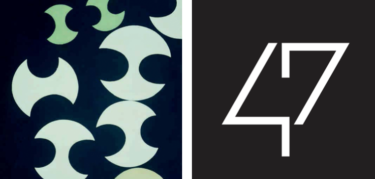 Дизайн логотипа Джо Миллера для пространства 47 (B) также показывает единство повторением. В данном случае это не многократное повторение, а простое повторение с поворотом, которое отличает «4» от «7». Созданная с использование похожих или связанных графических элементов, головоломка поражает зрителя и приводит к запоминающемуся логотипу.