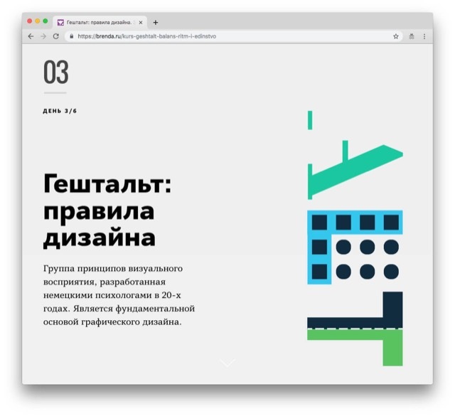 | | | 1 — Закон фигура-фон. 2 — Закон групировки (близости). 3 — Закон повторения 4 — Закон непрерывности. 5 — Закон сходства. 6 — Закон симметрии. Больше узнать о законах восприятия информации в платном уроке «Гештальт: баланс, ритм и единство» | | | | | Купить интерактивный онлайн-курс по графическому дизайну | | Два клика — образовательный онлайн-курс по графическому дизайну. Содержит проверочные тесты, профессиональный словарь терминов и интерактивные примеры. Предназначен для дизайнеров, менеджеров, маркетологов и предпринимателей. | | | | | | | | В следующих уроках — Введение в гештальт. Основные принципы визуального восприятия в графическом дизайне | | | | Гештальт (форма, образ) – объединение вещей (звуки, визуальные элементы, чувства) в единое целое. Теория гештальта как раздел психологии, основанная в 1890-х годах, зародилась в Германии в 1920-х годах.