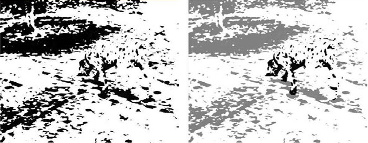 | | | | РИСУНОК 14: Гештальт в изображении. Когда зритель обрабатывает, казалось бы, случайное расположение черных фигур на белой странице (слева), человеческая тенденция находить и распознавать узоры позволяет появиться изображению далматина (справа) под лиственным деревом. | | | | Например, на рис. 14 представлена черно-белая визуализация собаки породы Далматин под тенью лиственного дерева.